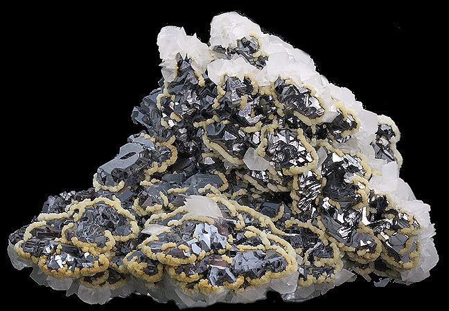 A great specimen of rhombohedral Calcite on Galena with complex twinning and, with a trimming of yellowish-brown Calcite. Presents well from several sides.