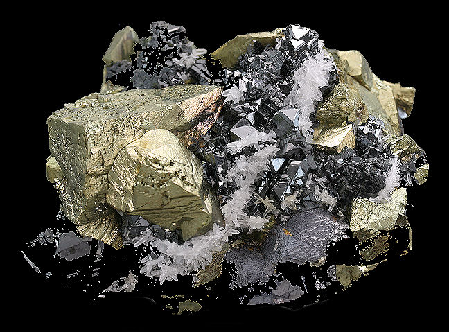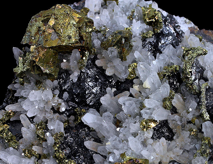 Nice combination of golden Chalcopyrite and contrasting Sphalerite with accenting Quartz and galena.