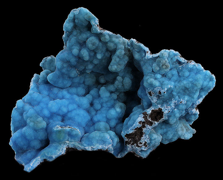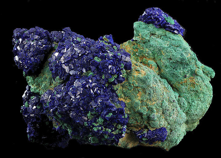 Highly lustrous rosettes of bright, azure blue Azurite blades, with desirable electic-blue highlights under bright light. Aesthetically placed on sturdy and sculptural botryoidal solid Malachite matrix. Azurite specimens on Malachite, especially in large size, are very rare from this locality.