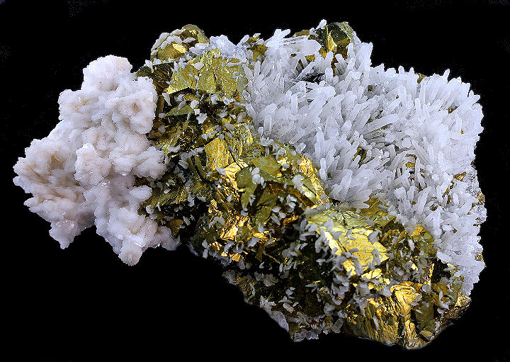 Brilliant, golden Chalcopyrite crystals with Quartz and Calcite. In the middle of the Quartz there is a small group of black Ferberite crystals. Very aesthetic.