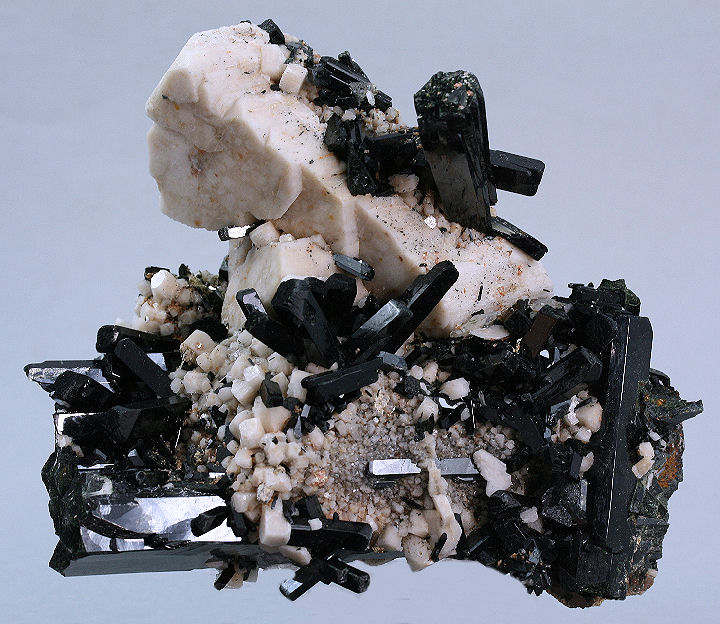 Stunning specimen of jet black, lustrous Aegirine crystals on Feldspar.