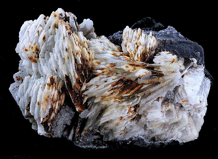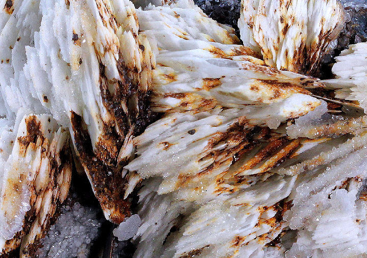 Wonderful specimen of white bladed Barite crystals accentuated by a druse of glistening Calcite and with a browish tint in spots due to Siderite. In excellent condition. Much better in person !!