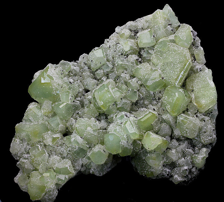 Blocky, light green glassy crystals of Datolite, partly coated with microcrystals of Apophyllite and Arsenopyrite. I bought this from a well-known Dealer at a past Tucson Mineral Show and was asking him what were the black microcrystals on the specimen. Although not labeled, he thought it was Arsenopyrite, but turned around and asked a gentleman standing outside the booth, who turned out to be Bill Smith, himself. Bill confirmed that is was Arsenopyrite and I got hold of his original inventory card, which traced back to where he obtained the specimen. This is a great specimen and the photos barely do it justice.