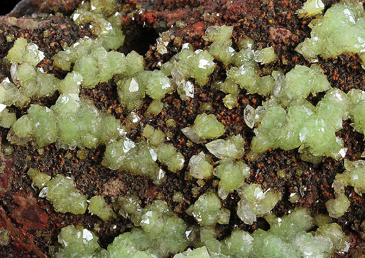 Nice coverage of light green, lustrous Cuprian Adamite crystals on Limonite.