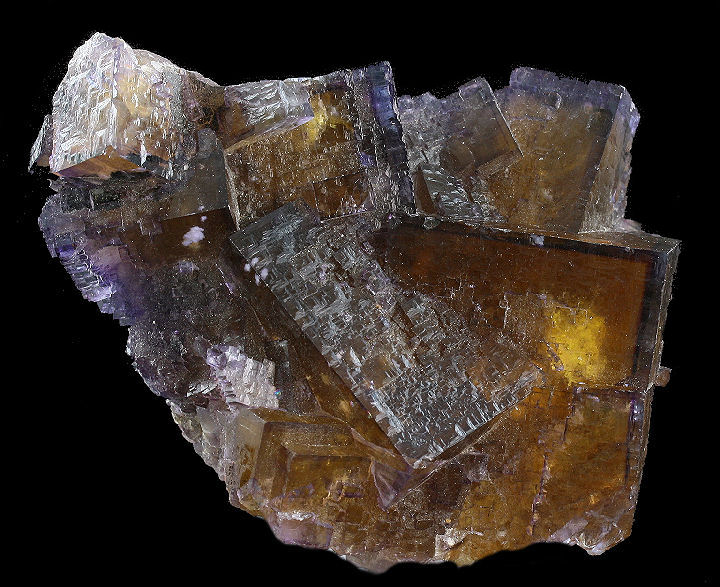 Very nice cluster of golden Fluorite crystals with purple outer zoning.