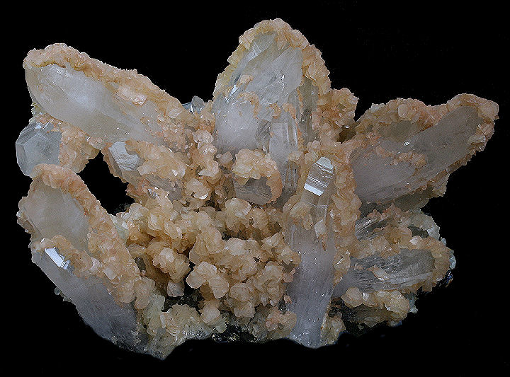 Very aesthetic cluster of Quartz partially covered with light brown Calcite crystals.