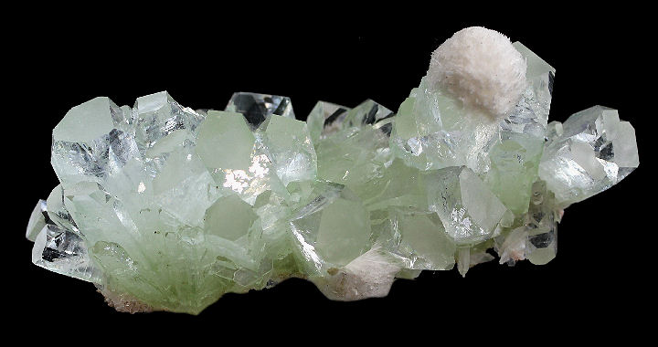 Gemmy, cubic Apophyllite crystals with light green color and, with an accenting white ball of Mordenite.