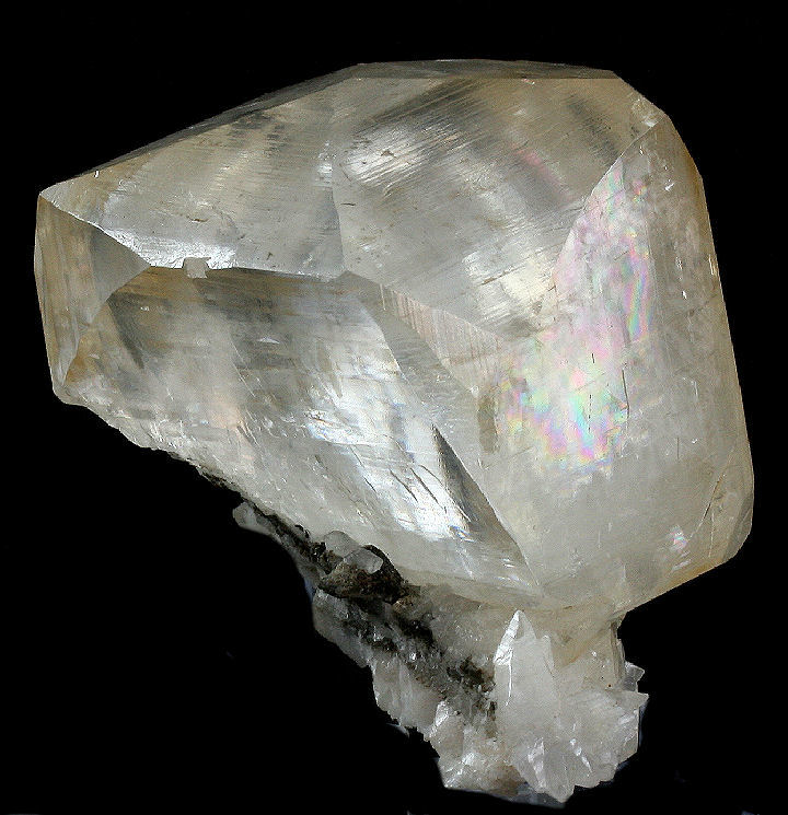 Superb, pristine, gemmy, complex Calcite crystal, pale yellow, bright, complete all around and nicely perched on a small bed of smaller Calcites. From a limited find of gemmy Calcites in the La Florida Mine. Even better in person !!