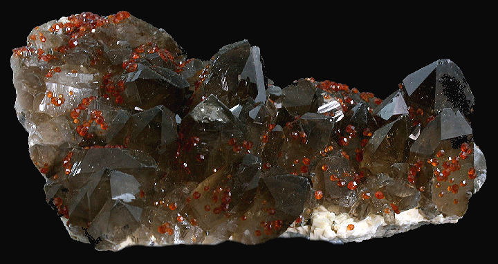 Super specimen of Spessartine Garnets on Orthoclase with thick coverage of dark Smoky Quartz crystals. In Fine condition.